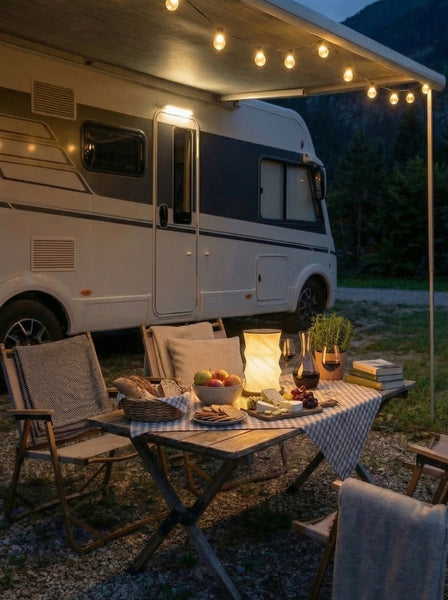 Den här eleganta bordslampan kombinerar minimalistisk design med smart funktion. Den vikbara lampskärmen sprider ett varmt och behagligt ljus som skapar en mysig atmosfär – perfekt för kvällar hemma, på altanen eller vid husbilen.