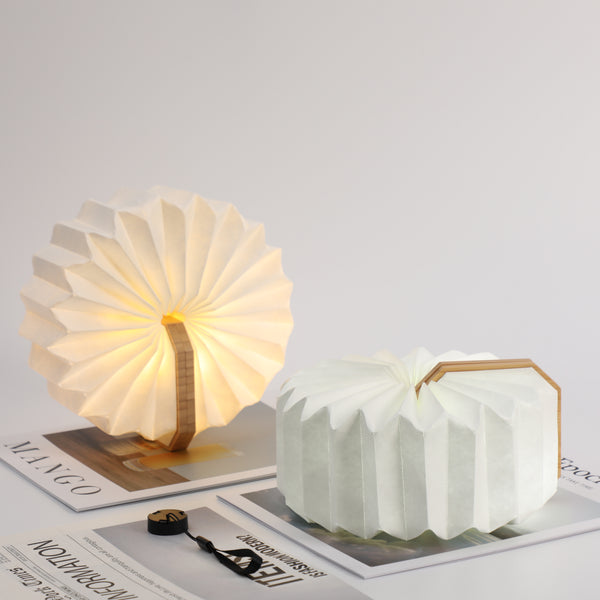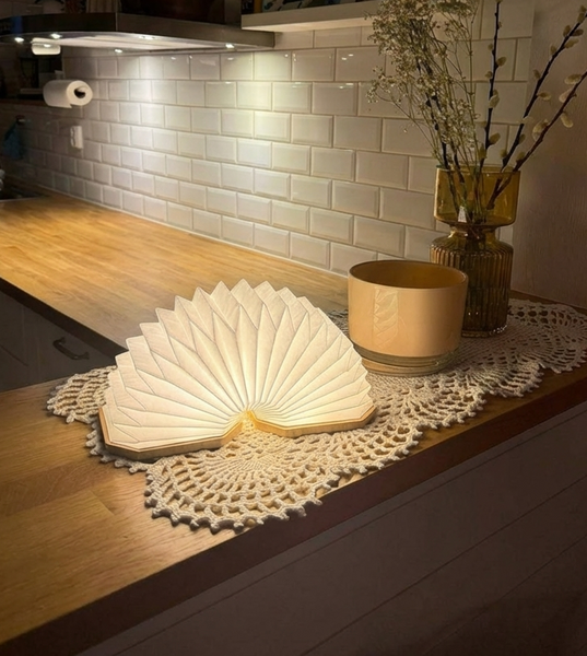 När du öppnar lampan vecklas den ut och skapar ett varmt stämningsljus som passar perfekt på nattduksbordet, skrivbordet, campingbordet eller i bokhyllan. Den kompakta designen gör den enkel att ta med sig och använda där du vill ha lite extra mysig belysning.